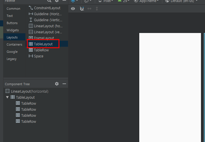 먼저 레이아웃에 테이블 레이아웃을 넣는 것으로 테이블 레이아웃을 사용할 수 있고