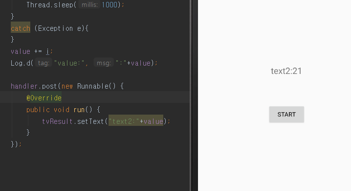 handler.post(new Runnable() { @Override public void run() { tvResult.setText("text2:"+value); } }); |