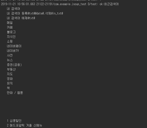 네이버의 html 코드를 가지고 와서 li 태그를 기준으로 모두 출력하는 모습.