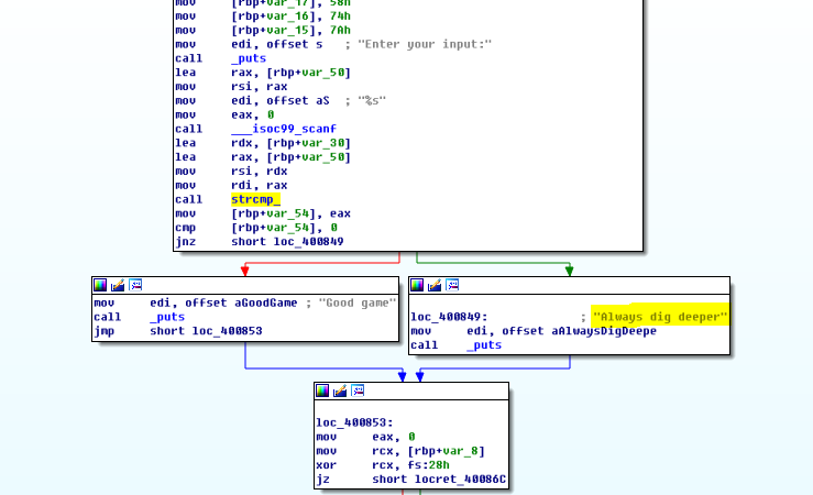 들어가보자. 이때 중요한것은 strcmp에 내가입력한값과 위에서 만들어놓은 문자열을 포인터로 가지고간다는점.